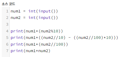 이번 문제는 나눗셈, 나머지 연산자의 개념이 필요하다. 두 숫사를 사용자로부터 세자리수를 입력받아, 연산 중간결과를 출력하는 문제이다.