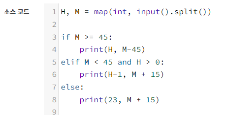 7라인 : H가 0일 때는 24시 즉, 밤 0시 0분이므로 23시를 출력하고, 분은 15분을 더한 값을 출력하면 된다.