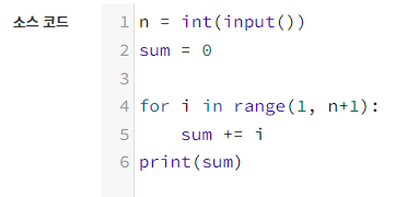6라인 : 1부터 n까지 더한 값을 출력해야 하므로 print(sum)해준다. 중요한 것은 출력문을 for문 안에 작성하는 것이 아닌 새로운 줄에 작성해야한다. 그렇지 않으면 출력초과가 된다.