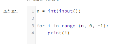 3~4라인 : 입력값부터 1까지 차례대로 감소해야 한다. range() 함수를 이용해 for문을 작성해준다. range의 첫번째 인자값은 초기값 a를 넣어준다. 두번째 인자값은 해당값을 포함하지 않아야 하기 때문에 0을 넣어준다. 마지막 값은 -1을 넣어 감소하게 해준다.