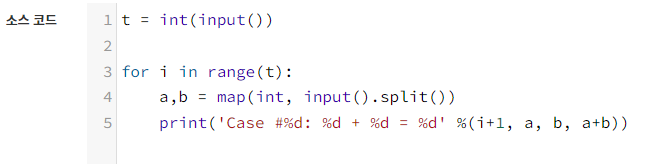 각 테스트 케이스마다 "Case #x: A + B = C" 형식으로 출력한다. x는 테스트 케이스 번호이고 1부터 시작하며, C는 A+B이다.