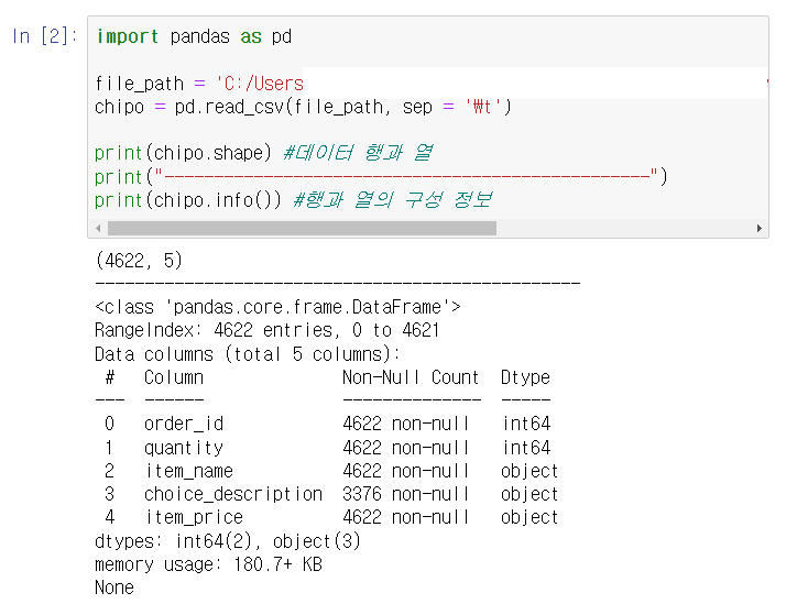 그리고 shape()와 info() 함수를 호출하면 위와 같은 실행 결과를 볼 수 있다. shape()는 데이터의 행과 열의 크기를 반환하고, info()는 행의 구성 정보와 열의 구성 정보를 나타낸다. 실행 결과를 보면 데이터가 4,622개의 행과 5개의 피처로 구성되어 있다. 또한 orer_id와 quantity는 int64(숫자), 나머지 3개의 피처는 object라는 타입으로 이루어져 있다는 것을 알 수 있다. 한 가지 특이한 정보는 choice_description 피처가 3,376개의 non-null object로 구성되어 있다. 이는 무엇을 의미하는 것일까?