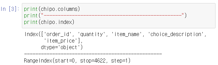 위 코드는 columns(행의 목록)와 index(열의 목록)를 호출하면 데이터의 행과 열에 대한 정보를 함께 출력할 수 있다.