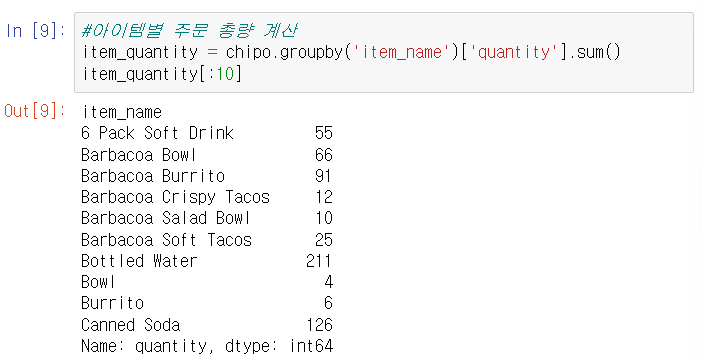 위의 코드 chipo.groupby('item_name')['order_id']. count()는 chipo Dataf에서 item_name을 그룹으로 order_id 피처의 count()를 계산한 것이다. 이는 아이템별 주문 개수를 의미하고 마찬가지 방법으로 chipo.groupby('item_name' ['quantity']. sum()은 아이템별 주문 총량을 나타낸다.