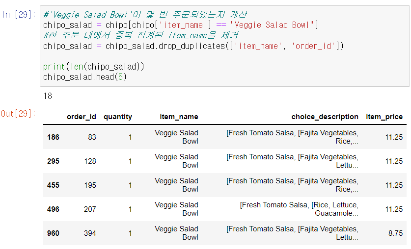 이를 위해 chipo [chipo ['item_name'] == "Veggie Salad Bowl"]으로 필터링한 뒤, drop_duplicates()라는 함수를 사용한다. 이는 한 주문 내에서 item_name이 중복 집계된 경우를 제거해주기 위함이다.
