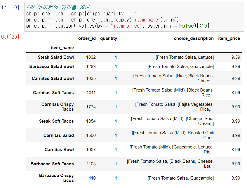 - item_price를 기준으로 정렬하는 sort_values() 함수를 적용한다. sort_values()는 series 데이터를 정렬해주는 함수이다.