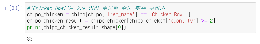 먼저 'Chicken Bowl'을 주문한 데이터만을 필터링한 뒤, 데이터 프레임에서 quantity가 2 이상인 것을 선택하면 이 결과가 'Chicken Bowl'을 2개 이상 주문한 주문 횟수를 의미한다. 2개 이상으로 필터링을 적용한 출력 결과는 다음과 같다.