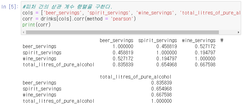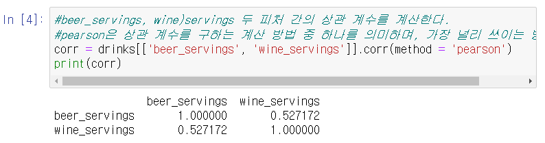 먼저 맥주와 와인 소비량의 상관관계를 알아보자. 아래 코드처럼 데이터 프레임에서 두 피처를 선택한 뒤, corr() 함수를 적용한다. 이를 통해 피처 간의 상관 계수를 matrix의 형태로 출력할 수 있다.
