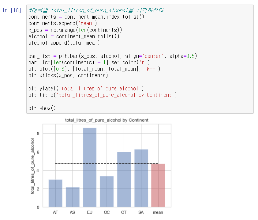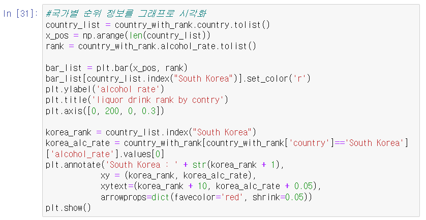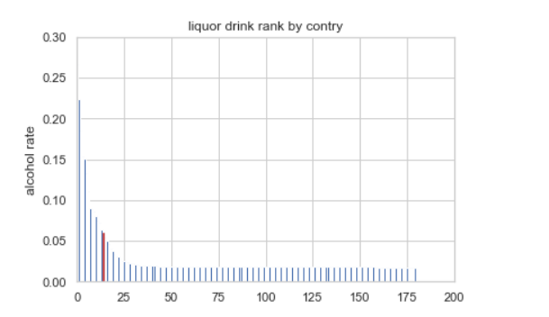 이 결과를 토대로 시각화를 수행한 결과는 다음과 같다. x_pos = np.arrange(len(country_list))를 통해 그래프의 x축에 해당하는 범위를 생성하고, rank = country_with_rank.alcohol_rate.tolist()를 통해 alcohol_rate순으로 정렬된 데이터에서 alcohol_rate 값을 생성하였다.
