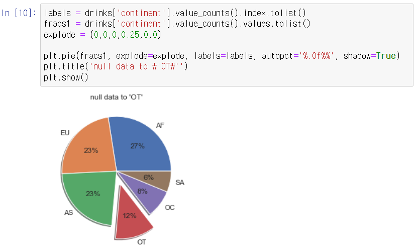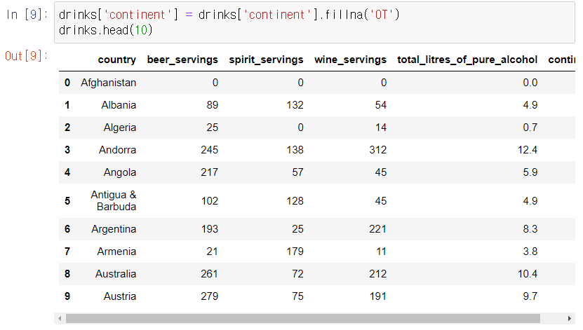continent 피처에 존재하는 결측 데이터를 처리해보자. fillna() 함수를 사용하여 drinks 데이터 프레임의 continent 피처의 결측값을 OT로 채워준다.
