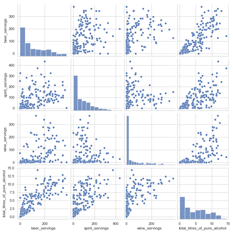 위 두 그래프를 살펴보면 total_litres_of_pure_alcohol 피처가 대체적으로 모든 피처와 상관관계가 있는 것으로 보이며, 특히 beer_servings와의 상관성이 매우 높은 것으로 나타난다. 첫 번째 그래프가 heatmap그래프, 두 번째 그래프가 pairplot 그래프이다.