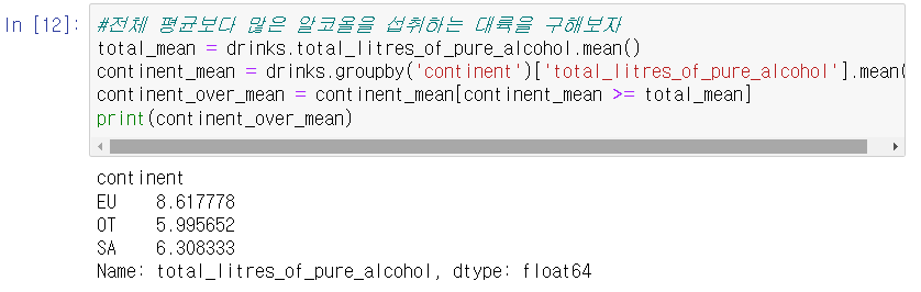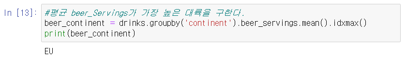mean() 함수만을 이용한 탐색에 idxmax() 함수를 적용하면 평균 'beer_servings'가 가장 높은 대륙이 어디인지 찾을 수 있다. idxmax()는 시리즈 객체에서 값이 가장 큰 index를 반환하는 기능을 수행한다.