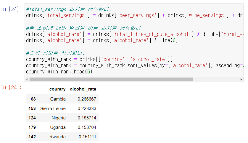 다음 '대한민국은 얼마나 독하게 술을 마시는 나라일까?'에 대한 탐색 코드를 살펴보자. 이를 판단하는 기준으로, alcohol_rate 피처를 생성한다. 이 피처는 total_litres_of_pure_alcohol 피처를 모든 술의 총소비량으로 나눈 것이다. 그리고 alcohol_rate는 sort_values() 함수를 사용하여 국가를 기준으로 정렬한다.