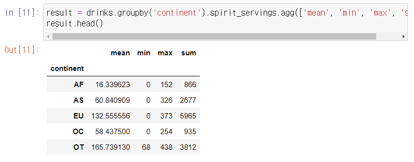agg() 함수를 사용하여 대륙 단위로 분석을 수행한다. agg() 함수는 apply() 함수와 거의 동일한 기능을 하지만, apply()에 들어가는 함수 파라미터를 병렬로 설정하여 그룹에 대한 여러 가지 연산 결과를 동시에 얻을 수 있는 함수이다. 대륙별 'spitit_servings'의 통계적 정보를 구하기 위해서는 agg에 ['mean', 'min', 'max', 'sum'] 파라미터를 입력하는 것만으로도 간단히 탐색이 가능하다.