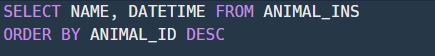 모든 동물의 이름과 보호 시작일을 조회하기 위해 SELECT NAME, DATETIME을 통해 원하는 컬럼을 출력할 수 있다. 결과는 ANIMAL_ID의 역순을 출력해야 하므로 ORDER BY 절을 이용해 ANIMAL_ID DESC 내림차순으로 출력한다.