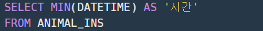 가장 먼저 들어온 동물 -> SELECT MIN(DATETIME) AS '시간'