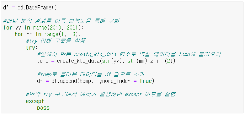 * 위 반복문 실행 시 에러 발생 -> 2020년 6월 데이터가 존재하지 않기 때문이다. 그러나 에러가 발생하기 전까지의 작업은 정상적으로 이뤄졌기 때문에 2010년 1월 ~ 202년 5월까지의 데이터는 잘 담겨 있다.